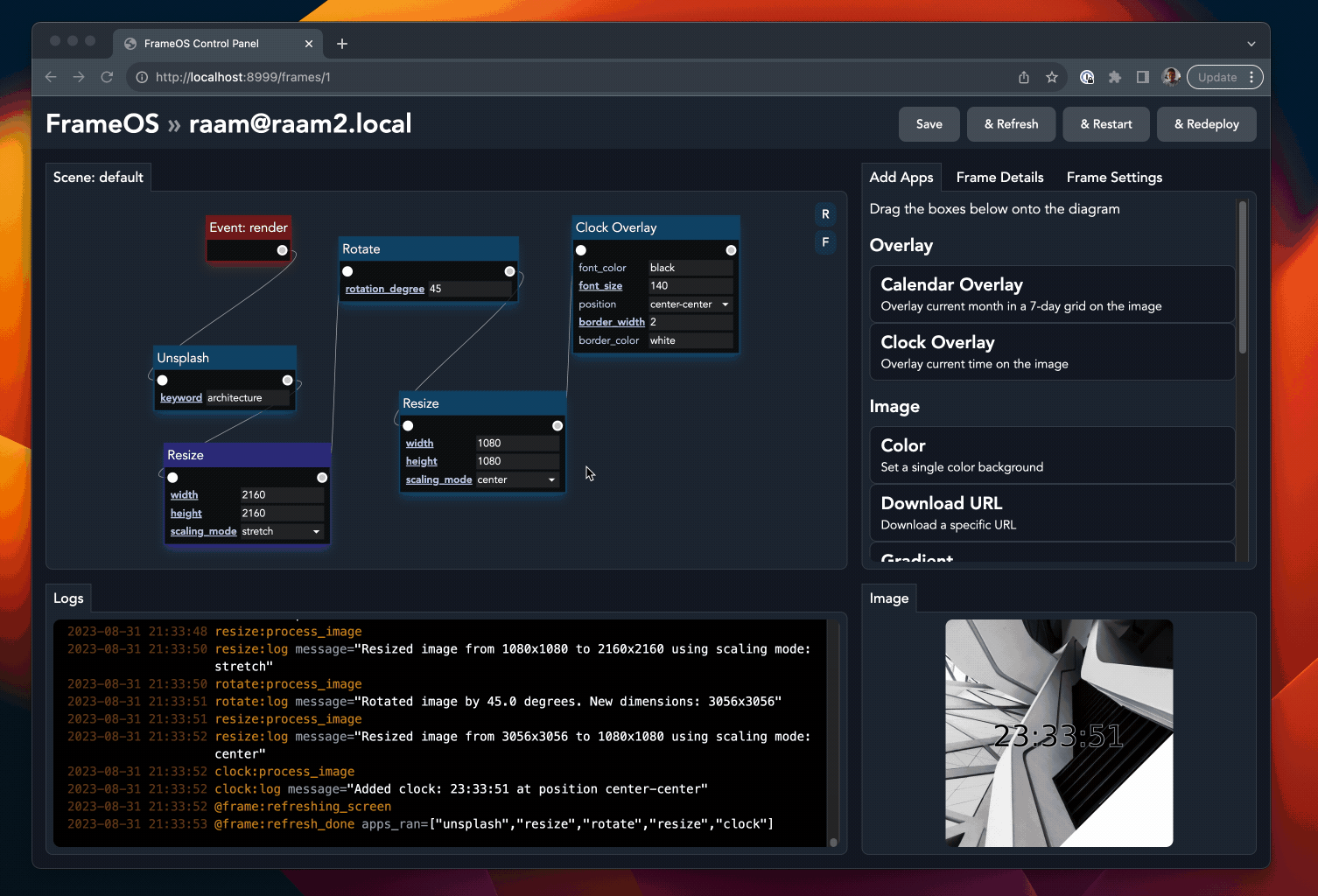 FrameOS is built in Nim, a compiled language. That means it's fast to run, but it takes time to deploy. We'll now compile all these scenes into a binary, and then run that on the frame.