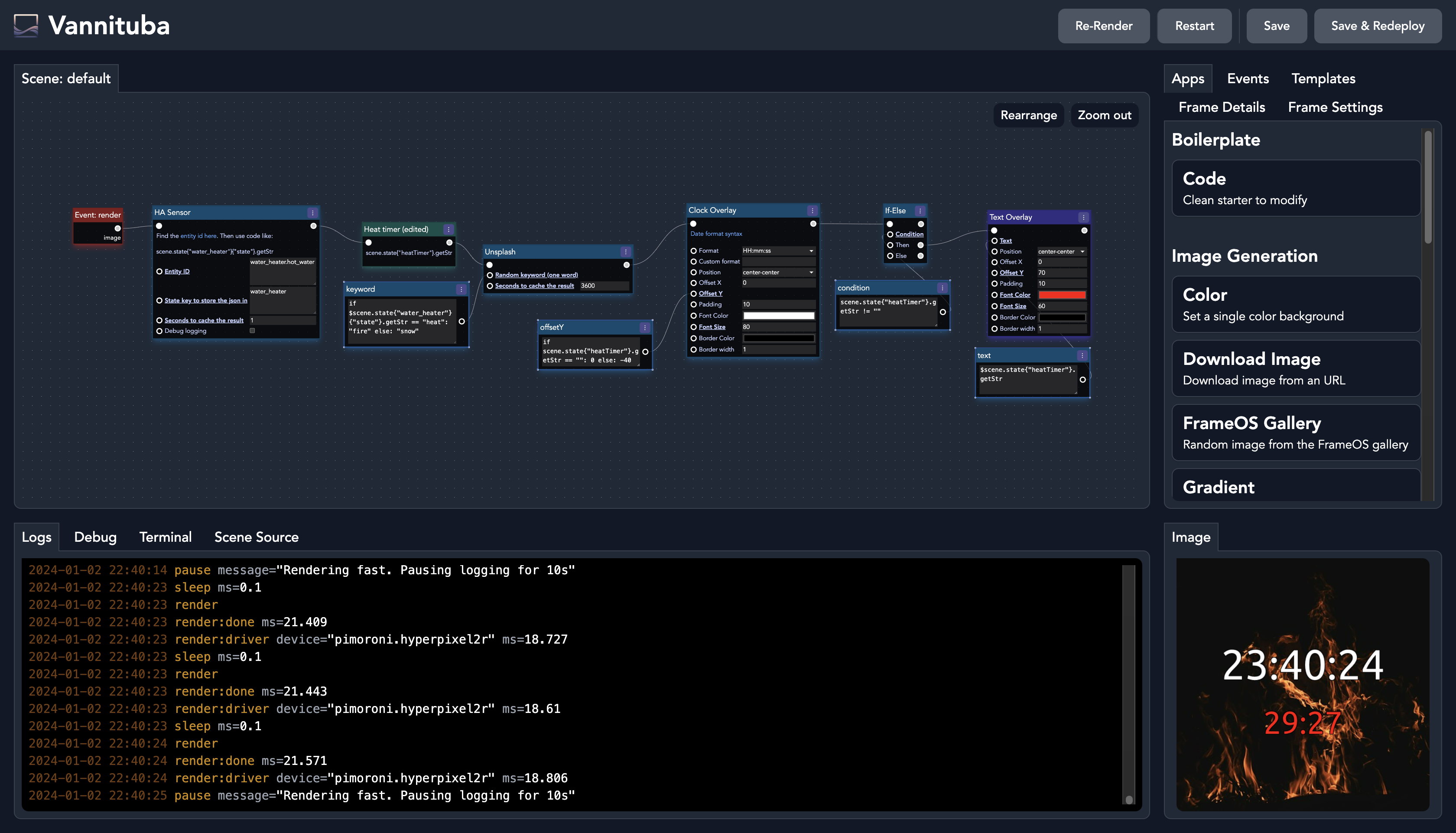 When you need something more complex than the included scenes, click "edit" and study how these scenes are built. There's always a "render" event that kicks off the whole thing, triggered at an interval. Then the blue "logic" nodes are executed, in the order that they're connected. Green "data nodes" fetch, transform or generate data, and also handle caching. Yellow "state nodes" are user provided input. Logic flows from left to right, data flows down. Pull from a handle to connect it to another handle, or to create a new node. You can also write quick nim code in code nodes with arguments, and you can edit the source behind whole apps. Save and check the "scene source" tab for syntax errors. When you're done, deploy your changes to the frame. If you run into issues, post on Github or ask the community on Discord for help.