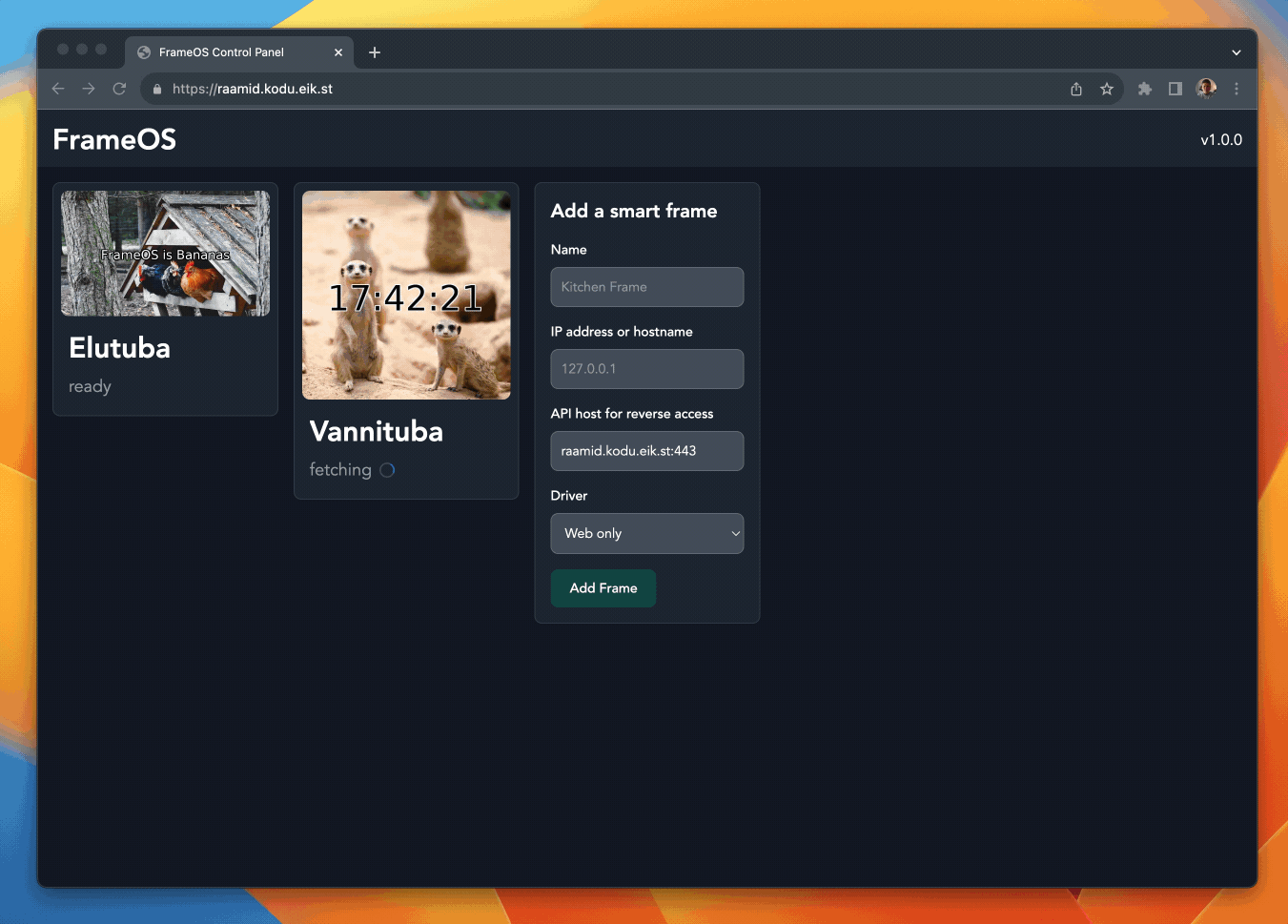 Go back to the FrameOS backend and add a new frame. Use the same hostname dot local you set earlier, and choose the right driver for your panel. In this case it's the waveshare 13.3"E 6-color spectra panel.